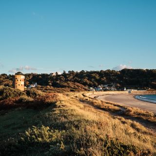 Ouaisné, the adjoining beach to St. Brelade's Bay is a south-west facing beach and wilder in contrast to the neighbouring St. Brelade's Bay. The two beaches are connected at low tide, or cross the pine-rich headland and walk along the sea wall next to the protected Ouaisné Common towards locals’ favourite, The Smugglers Inn.