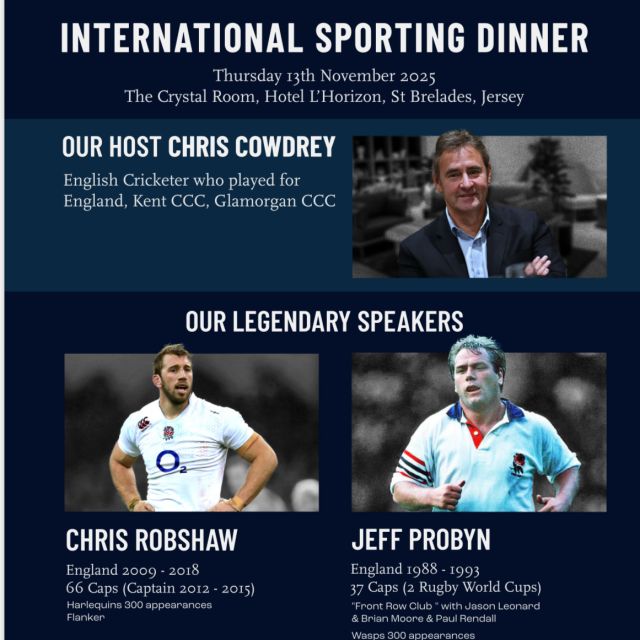 We are excited to announce the International Sporting Dinner on Thursday 13th November 2025 at L'Horizon Beach Hotel & Spa, hosted by England cricketer, Chris Cowdrey, and starring rugby legends Chris Robshaw and Jeff Probyn as our special guest speakers for the evening.
